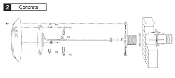 FM series lights are designed to be mounted flat on the wall onto the supplied bracket. There are adapter brackets that allow thru wall mounting similar to the TM series if required. Allow for approximately 1m of cable to be coiled and stowed behind the light to allow the light to be lifted to the surface for replacement if required. The cable exit point is resin filled to eliminate any risk of leakage. In the case of retrofits usually a light with a 1.5m cable is used and the cable is joined to the existing wiring using a waterproof connection or routed back to a junction box or termination point. For new installs the lights are available with 10m or 20m cables.