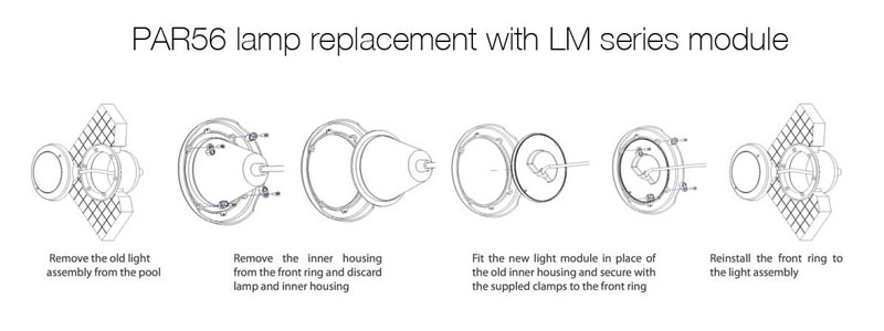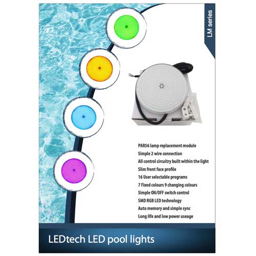 LM series light modules are a great way to upgrade your existing PAR56 pool light installation. With the same 16 programs and colours as our other LEDtech lights, they offer a energy efficient and long reliable life over the standard incandescent lamps. Available with either 546 or 630 SMD LED’s and a choice of cable lengths. In many cases where the original inner PAR56 light housing is poor condition the lights can become an even more attractive option as many of the original light housing components are not re used during retrofit.
