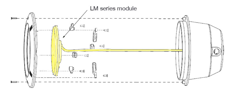 The light module is simply fitted to the original face plate using the supplied clamps and the lights cable attached to the original wiring using a waterproof connection or if possible the lights cable can be routed back to a suitable external junction box. as the cable entry point into the light module is resin filled, the connection to the existing wiring is carried out external to the light by waterproof connection or routing the cable to a junction box